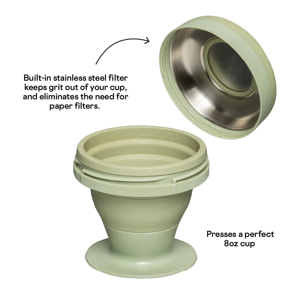 Pour over meets French Press with the Corkcicle Palmpress. This portable, lightweight brewing container creates a perfectly balanced, high quality 8oz brew in 3 minutes. Similar to the AeroPress inverted method, the Palmpress allows the coffee grounds to be immersed in water longer than a pour over, so you can customize your perfect pour. Perfect for making Espresso, Americano, Cold Brew and more!